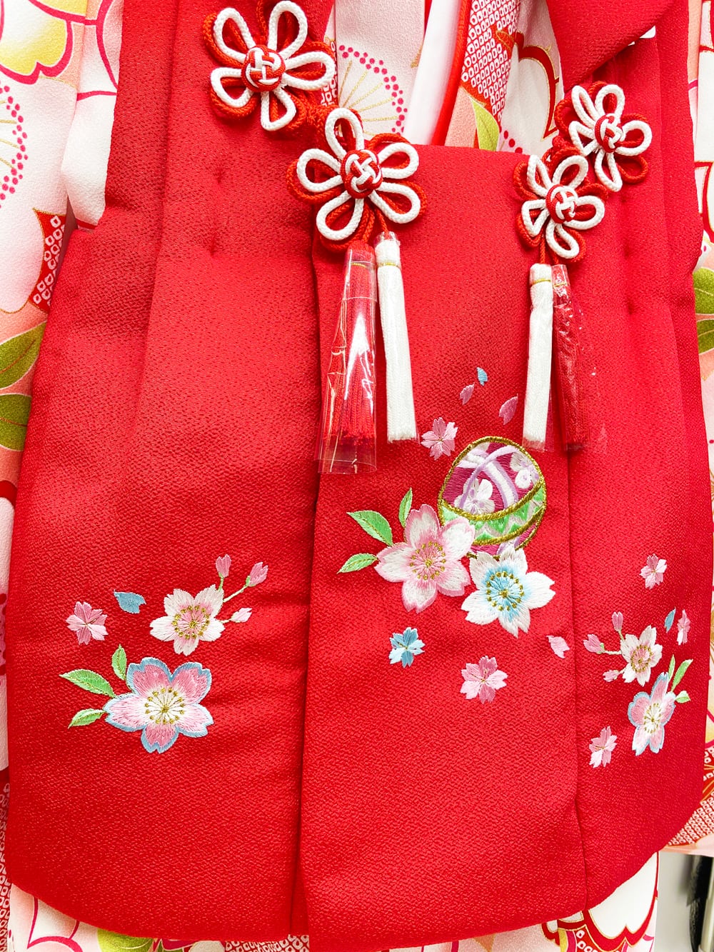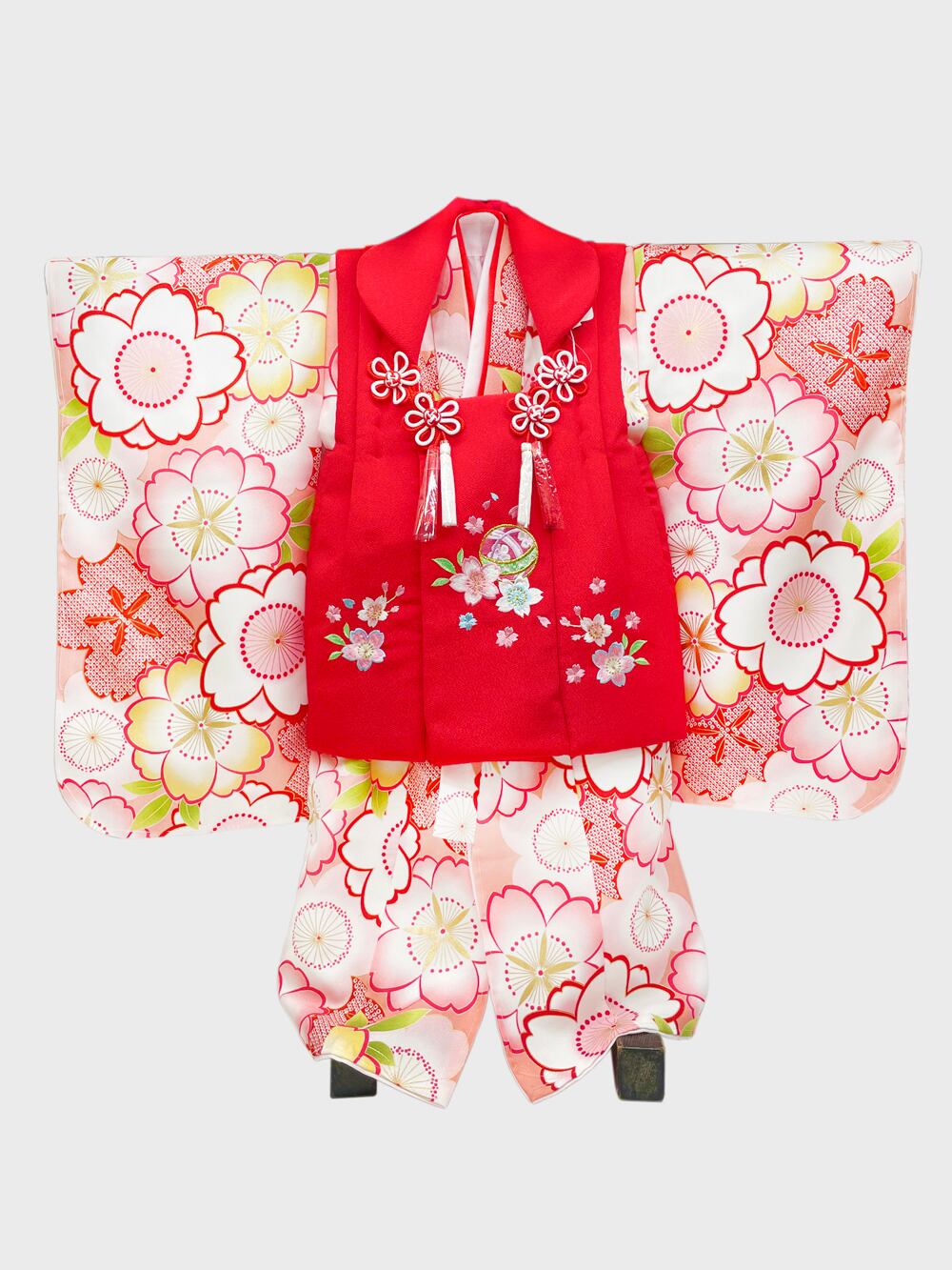 商品情報:三つ身着物、被布コート、髪飾り、巾着、草履のお得な5点セット。